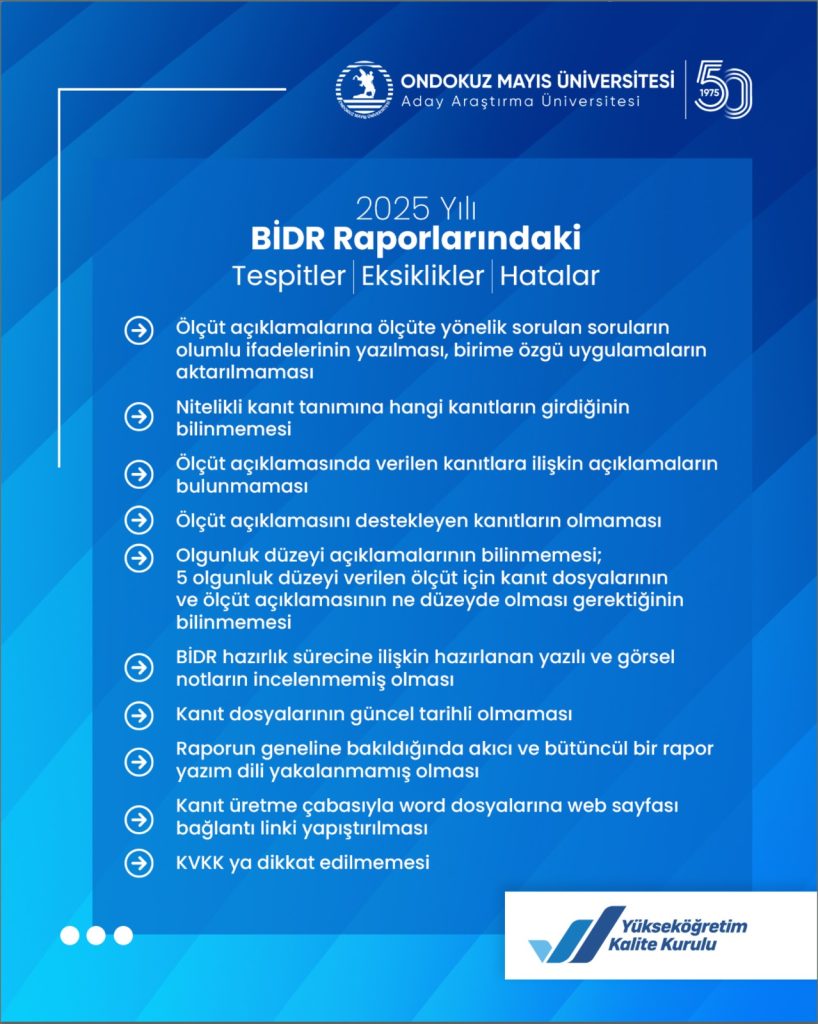 Kalite koordinatörlüğü tarafından YÖKAK KİDR hazırlama kılavuzundan yer alan 46 ölçüte yönelik, her bir BİDR incelenerek hazırlanan 2024 – Birim İç Değerlendirme Raporları Değerlendirme ve İzleme Sonuç Raporu, OMÜ Kalite Komisyonu toplantısında görüşülerek kapsamlı şekilde ele alındı. Komisyon tarafından yapılan değerlendirmeler doğrultusunda belirlenen tespitler ve iyileştirme önerileri ilgili akademik ve idari birimlere iletildi. Böylece Birim İç Değerlendirme Raporu yazımı sürecinde önceki dönemlerden kaynaklanan sorunların giderilmesi ve kalite süreçlerinin sürekli iyileştirilmesi hedeflenmektedir.